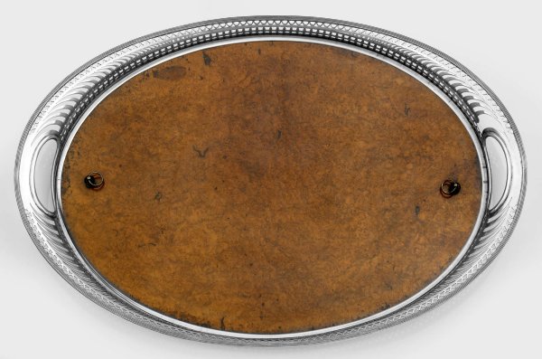 Seltenes Silbertablett Silber. Spiegel aus karelischer Maserbirke, furniert. Oval mit Glaseinsatz zum Anheben. Breiter, ausgestellter Rand mit umlaufendem Wellendurchbruchdekor, an den Schmalseiten Griffe ausgespart. Gest. Minervakopf 833, Herstellerzeichen. L. 55 cm.