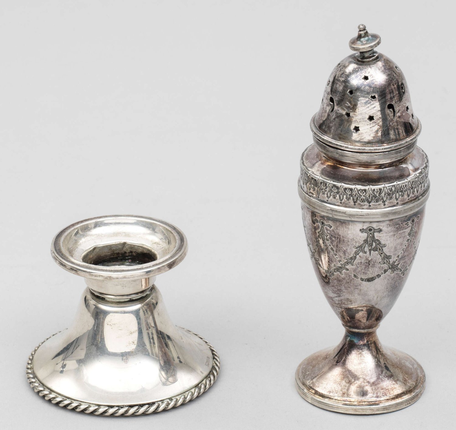 Tafelleuchter und Zuckerstreuer Silber bzw. plated. Von einem Kordelband umzogener, beschwerter Tafelleuchter, gest. 835, Herstellerzeichen. Versilberter Streuer im Empirestil. Minim. besch.; H. 7 cm - 18,5 cm.