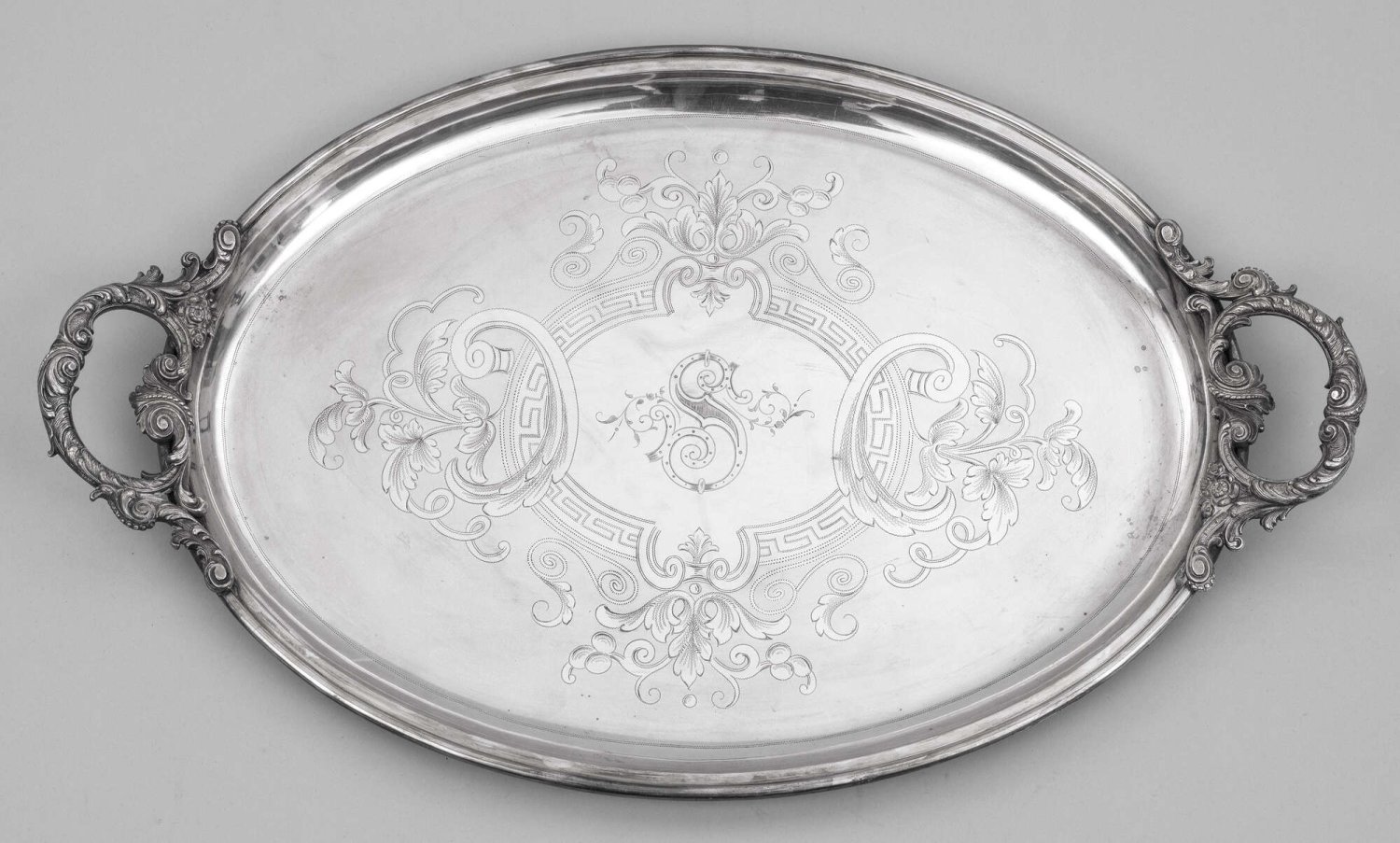 Großes Tablett Plated. Oval. Im vertieften Spiegel von Blattranken und Mäanderfries gerahmte Monogrammkartusche. Hochgezogene Griffe aus reliefplastischen Blattvoluten und Blüten. Gem., Herstellerzeichen. 67 cm x 42 cm.