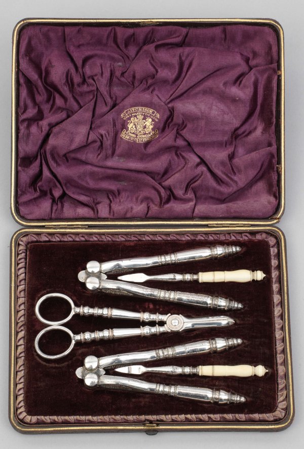 Nussknacker-Set im Original-Etui. Plated bzw. Eisen, poliert. 5-tlg.; 2 Nussknacker, Traubenschere und zwei Nussöffner mit gedrechseltem Elfenbeingriff. Minim. altersgemäße Gebrauchsspuren.