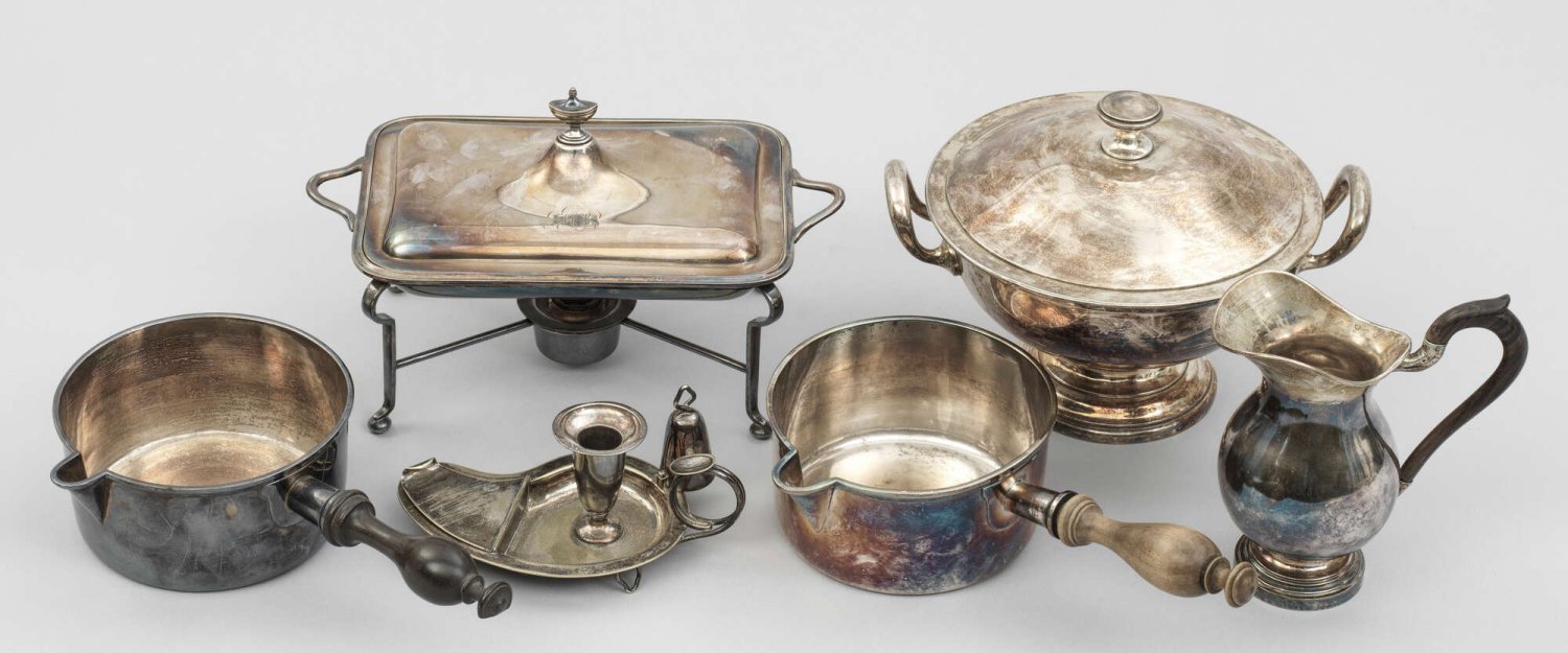 Konvolut Tischaccessoires Plated. 6-tlg.; Deckelterrine, Servier-Deckelschale mit Rechaud, 2 Kasserollen. Schenkkanne und Handleuchter. Minim. altersgemäße Gebrauchsspuren. Teilw. gem., Herstellerzeichen.