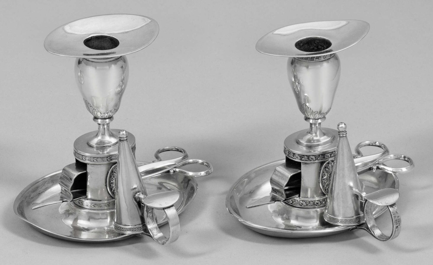 Paar Handleuchter Silber. Ovaler, leicht gemuldeter Stand mit seitlichem Ringgriff, daran kegelförmiger Löschhut. Mittig ovaler Sockel mit reliefplastischen Applikationen und Relieffriesen sowie mittig Aussparung für Dochtschere. Vasenförmige Tülle mit herausnehmbarer Traufschale. Dekor gering abweichend. Minim. altersgemäße Gebrauchsspuren. Gest. 13 Lot bzw. 800, Stadtmarke, Herstellerzeichen. Gew. zus. ca. 690 g. H. 12,5 cm.