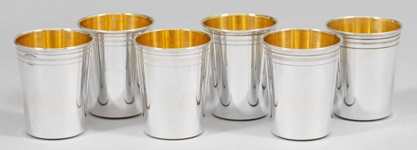 Sechs Becher Silber. Konisch mit glatter Wandung. Unterhalb des Randes gravierter Eierstabfries. Innen vergoldet. Gest. 925. Gew. zus. ca. 770 g. H. 9 cm.