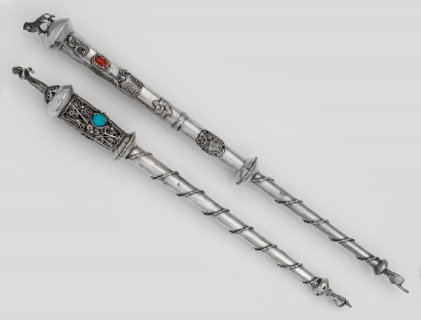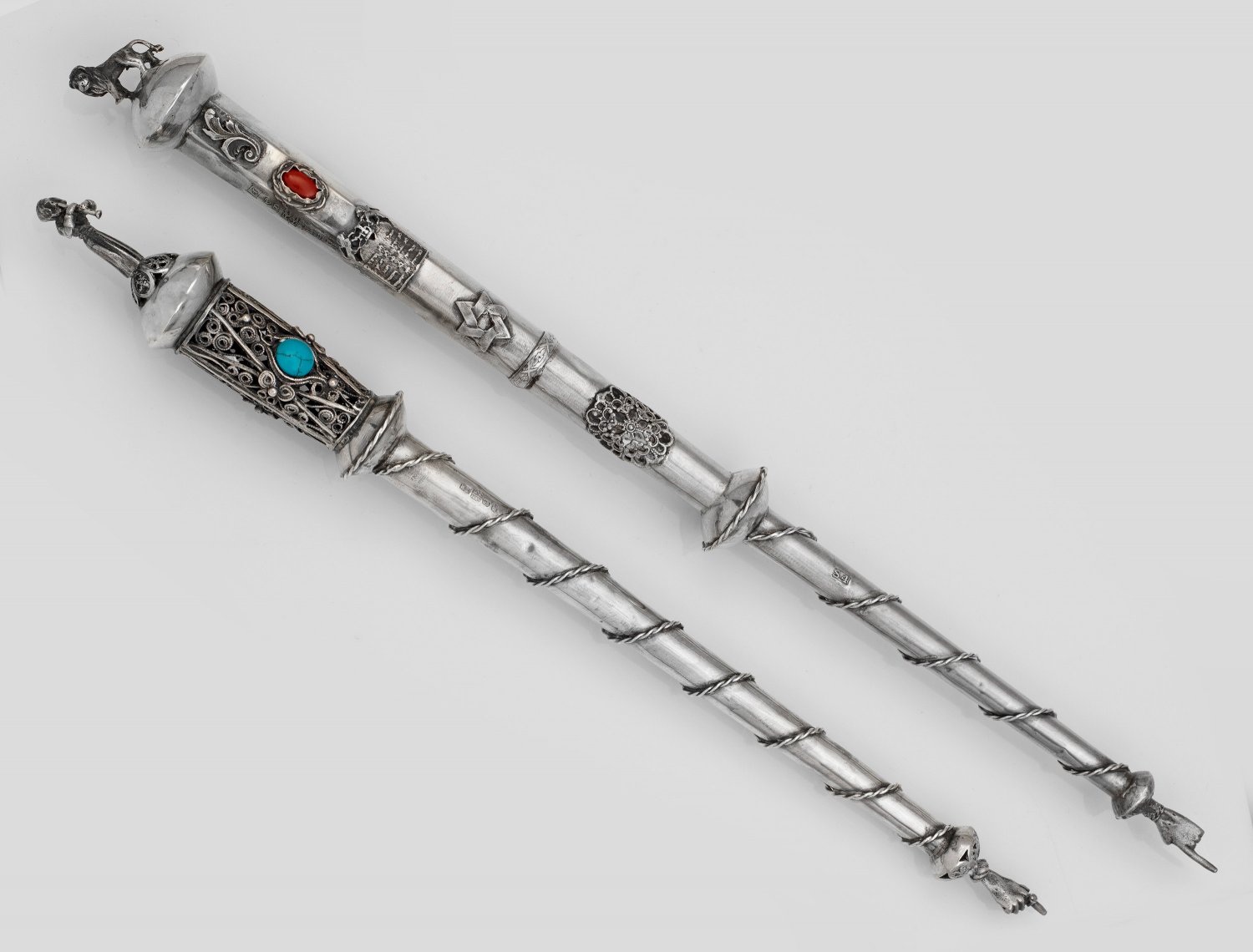 Zwei Torazeiger Silber. Runde, konisch zulaufende, in eine Hand übergehende Schäfte. Mit Karneolcabochons bzw. Türkis und umlaufenden Kordelbändern besetzt. Auf zylindrischem Griff unter anderem reliefplastischer Davidstern und Gesetzestafeln mit den Zehn Geboten. Knäufe in Form eines Löwens sowie Fanfarenspielers. Gest. 84, russische Pseudomarken. Teilw. rest.; L. 33 - 37 cm.