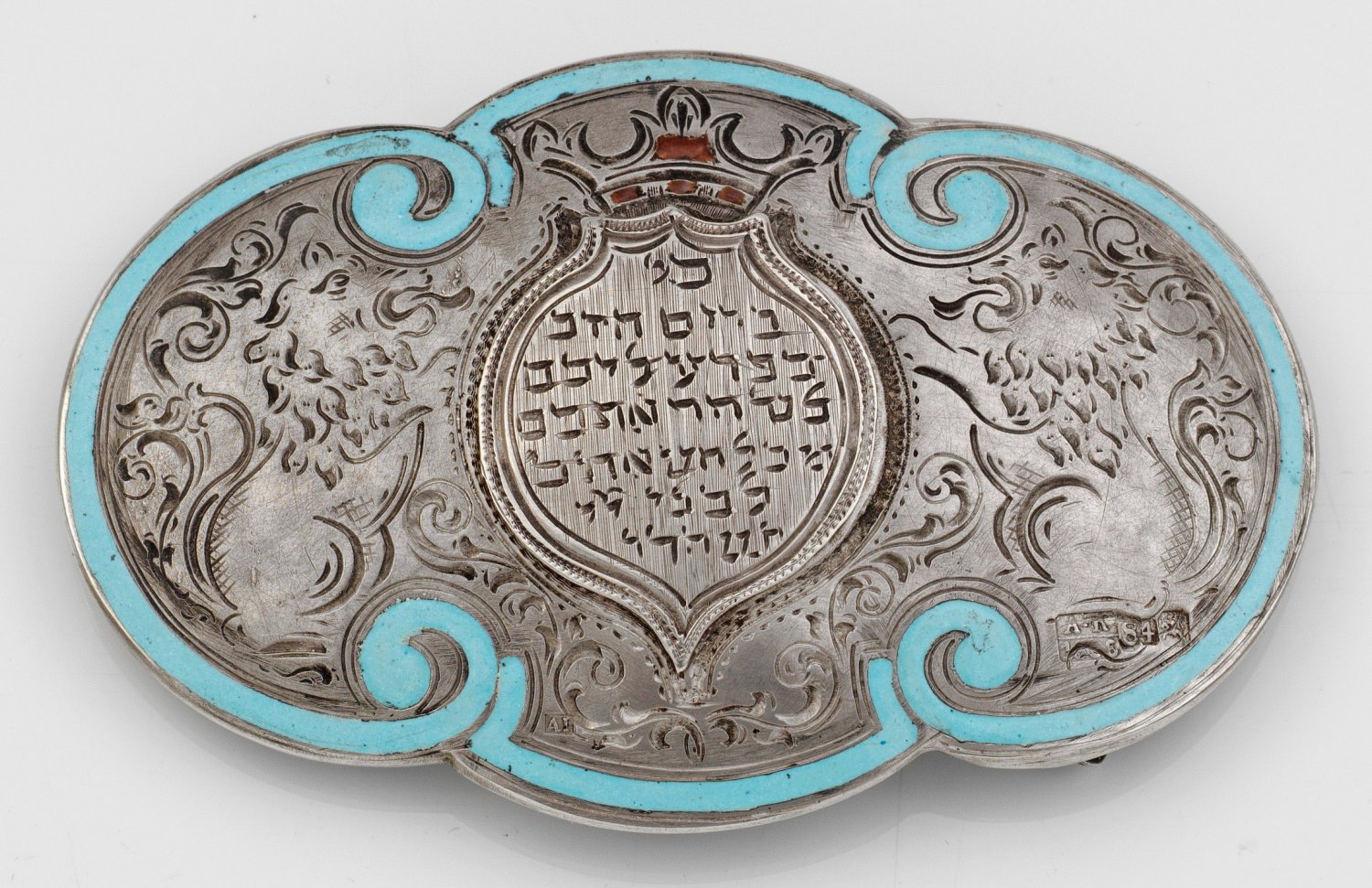 Gürtelschnalle Silber, ziseliert und teilw. emailliert. Unter zentral dargestellter Krone, Kartusche mit Hebräischer Schrift. Flankiert rechts und links von zwei ziselierten, steigenden Löwen. Gerahmt von hellblau emailliertem Ornamentenband. Gest. 84. Russische Pseudomarken. Gew. ca. 50 g.