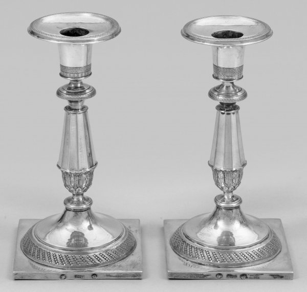 Breslauer Biedermeier-Leuchterpaar Silber. Auf quadratischer Plinthe gefußter runder Stand. Auf reliefierten Blattkranz zwölfseitiger konischer Schaft. Vasenförmige Tülle mit herausnehmbaren Traufschalen. Gest. Stadtmarke, Ältermannbuchstabe Q (1822-1834), Meister Johann David Klose (Meister 1816 - 1848). Gew. zus. ca. 269 g. H. 15 cm. 8 cm x 8 cm.