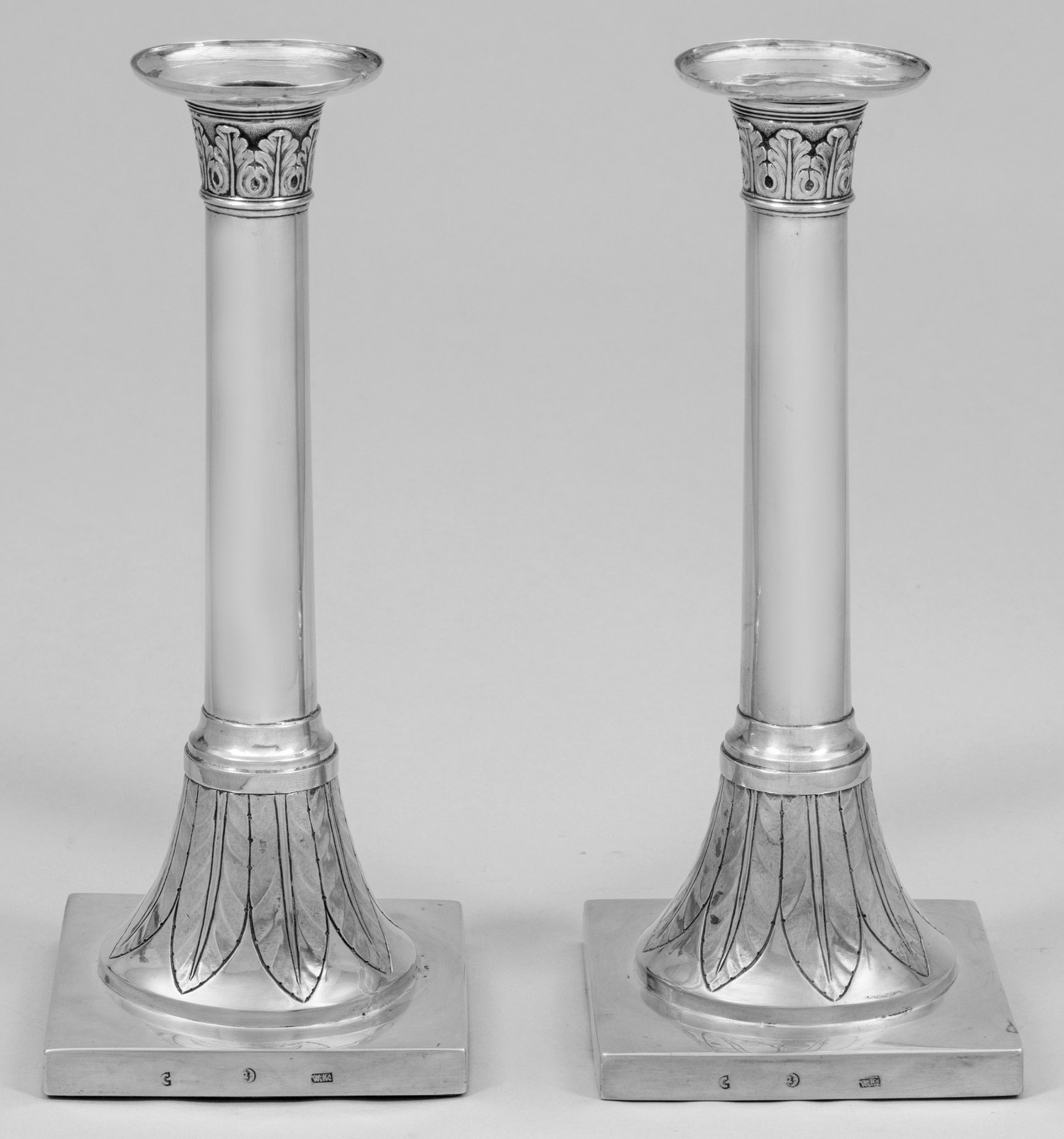 Paar Lüneburger Empire-Kerzenhalter Silber. Auf quadratischer Plinthe gefußter runder, trompetenförmiger mit Blattfries umzogener Stand. Glatter, zylindrischer Schaft. Reliefplastisches mit Akanthusblättern gerahmtes Kapitell. Herausnehmbare Traufschalen best.; Beschwert. Stadtmarke, Ältermannbuchstabe C, Meistermarke Christian Wilhelm Wille (wird Meister 1771). H. 24 cm. 10 cm x 10 cm.