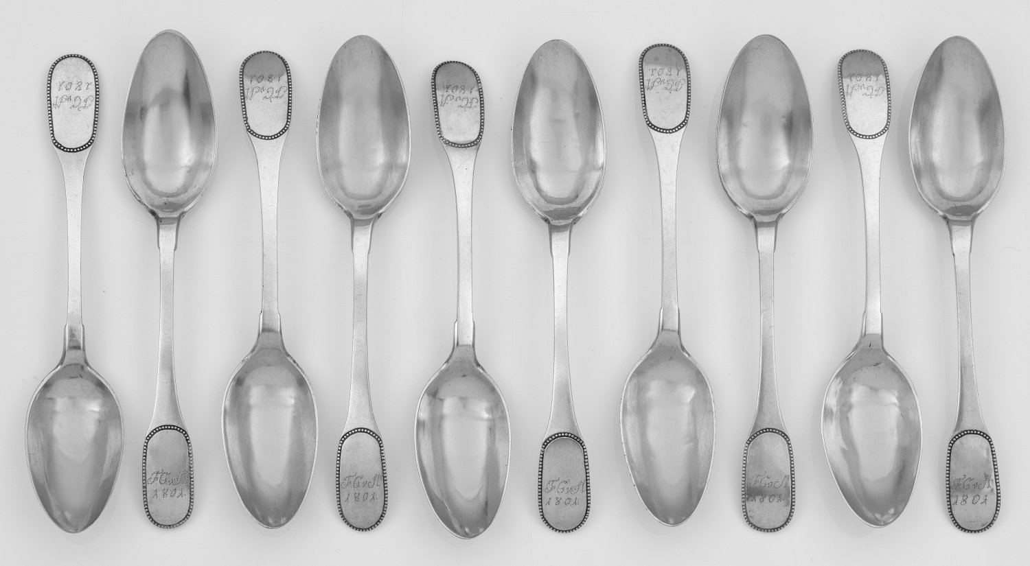 Zehn Braunschweiger Löffel Silber. Spitzovale Laffe, übergehend in spatenförmigen Griff. Am Stiel perlenumrandete Monogrammkartusche mit Punktgravur "F.C.v St 1801" über älterer Gravur von 1799. Stadtmarke, Ältermannbuchstabe S (1816-1822), Meister Johann Christoph Hildebrandt (Meister 1796). Gew. zus. 582 g. L. 21 cm.