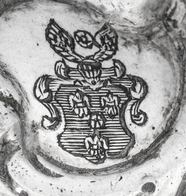 Stettiner Rokoko-Schöpfkelle Silber, teilvergoldet. Geschwungener Griff mit Rocaille und floralen Motiven. Graviert mit Adelswappen drei Lilien auf blauem Grund. Innen vergoldet. Tremolierstrich, Preußische Steuermarke FW (1809 - 1812), Meisterzeichen ICV wohl Johann Christian Voggelaer (wird Meister 1770). Gew. ca. 263 g. L. 34 cm.