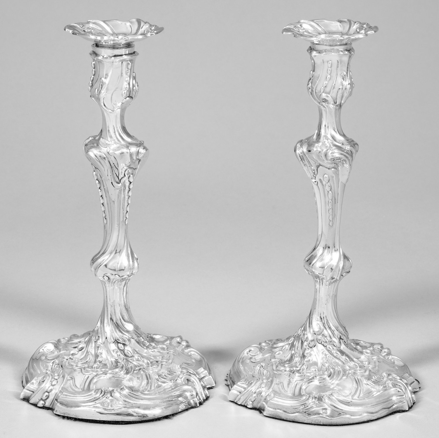 Paar Georgianische Tafelleuchter Silber. Flacher, von reliefplastischen, passigen Voluten gerahmter Stand, beschwert. Mittig aufsteigender, hoher Balusterschaft, übergehend in schlanke, blütenkelchförmige Tülle. Passig geschweifte, herausnehmbare Traufschale. Korpus umlaufend gegliedert durch reliefplastische Voluten, Rocaillen und Perlfriese. Gest., Beschaumarken, Meister William Tuite. Beschwert. H. 28 cm.