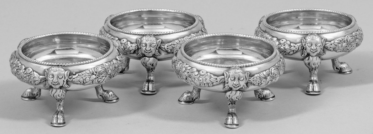 Seltener Satz von vier Barock-Salieren Von Ziegenfüßen getragener, gedrückt bauchiger Korpus mit ausschwingendem, passigem Rand. Auf der Wandung drei reliefplastische Satyrmaskarons, verbunden durch naturalistische Blütenfestons. Gest., Beschaumarken, Meister David Hennell I. (wird Meister 1739). Gew. zus. ca. 748 g. H. 5 cm. D. 8,7 cm.