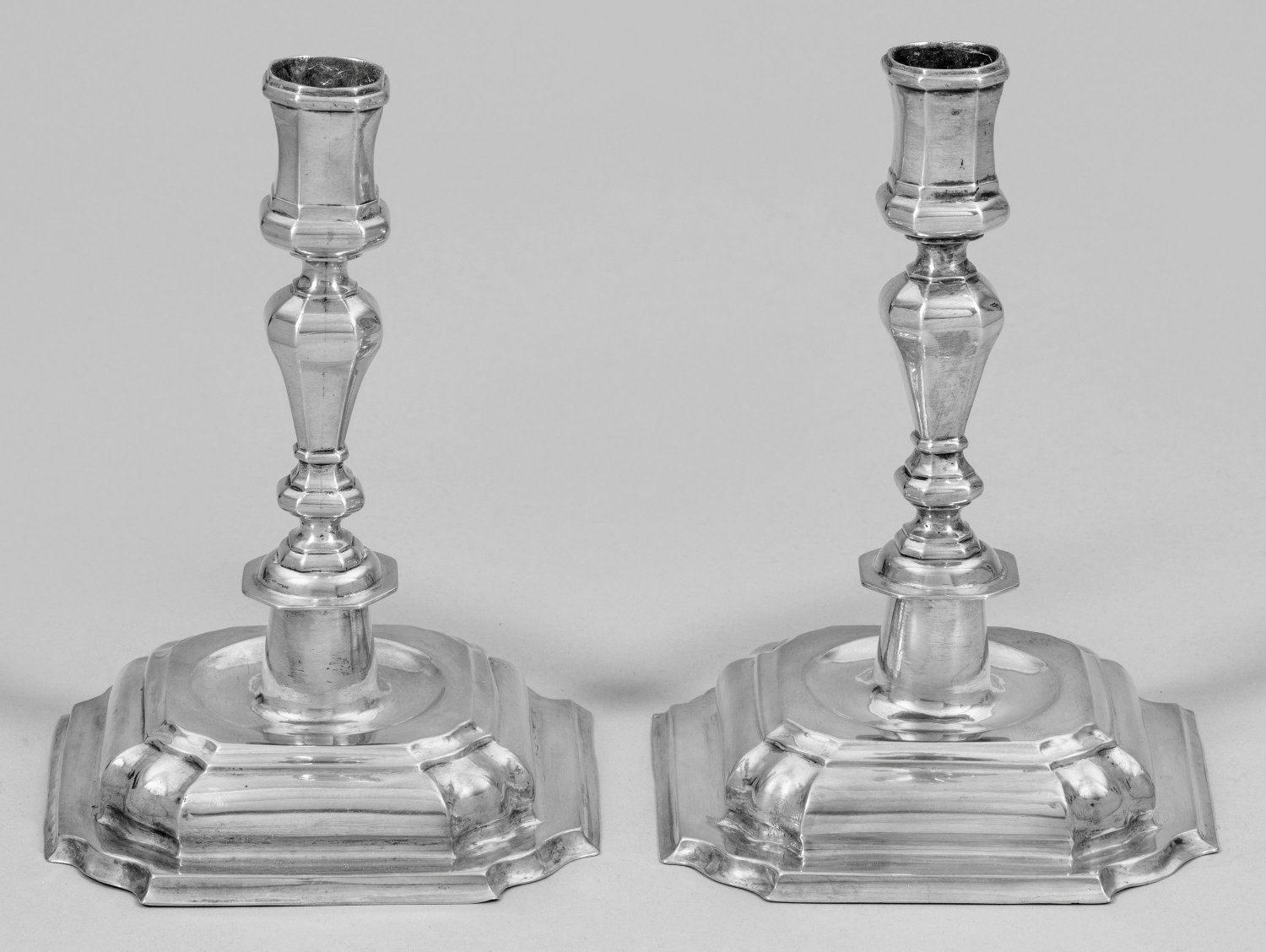 Paar Leutschauer Tafelleuchter Silber. Vierseitiger Stand mit passig geschweiften Ecken. Über gemuldetem Ansatz mehrfach profilierter Balusterschaft, in vasenförmiger Tülle endend. Stadtmarke, Meister Paulus Löw (wird Meister 1760). Gew. ca. 611 g. H. 17,5 cm.