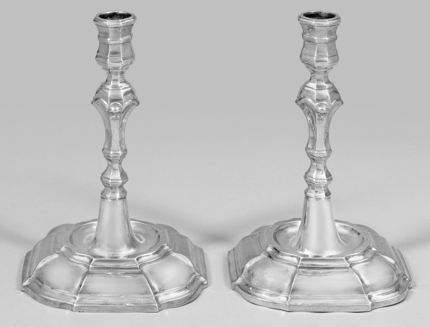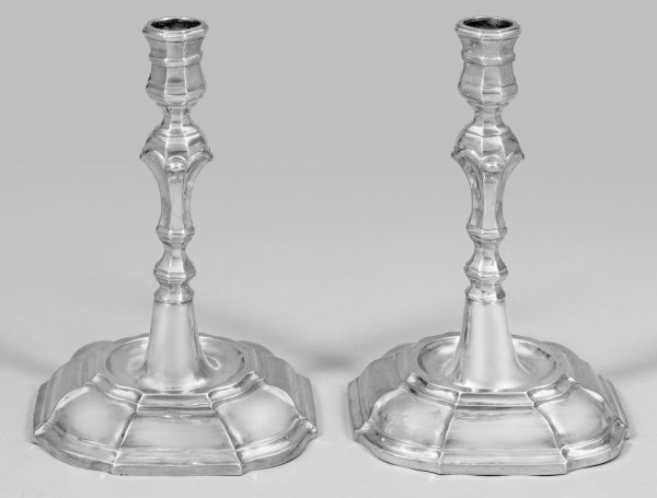 Paar Barock-Tafelleuchter Silber. Vierseitiger Stand mit passig geschweiften Ecken. Über gemuldetem Ansatz hoher, profilierter zwölfseitiger Balusterschaft in vasenförmigen Tüllen endend. Unbekannte Stadtmarke, undeutliche Meistermarke ICB. Gew. ca. 588 g. H. 17,5 cm.