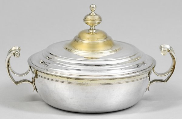 Lüneburger Deckelschale Silber. Runde, konische Schale mit eingerollten Handhaben. Gestufter Stülpdeckel mit Knauf. Eingravierte Gewichtsangabe 34 5/8 Lt.; Innen vergoldet. Beschaumarke, Meister Christopher Schultze (wird Meister 1739). Gew. ca. 494 g. H. 12 cm. D. 14,5 cm.