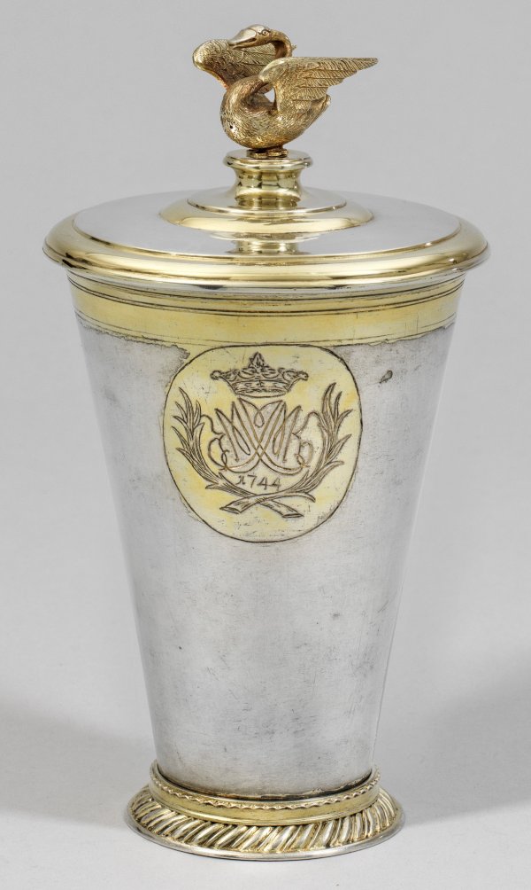 Stangenbecher mit Deckel Silber, teilvergoldet. Konische glatte Wandung auf ausgestelltem, schräg gerieftem Fuß. Graviert mit bekröntem, 1744 dat. Monogramm in vergoldetem Medaillon. Oberer Rand, ausgestellter Lippenrand und Innenwandung vergoldet. Der Deckel mit plastischem Schwan bekrönt. Stangenbecher wurden häufig in Mittel- und Osteuropa in der 1. Hälfte des 18. Jh. gefertigt. Sie dienten als Willkomm bei besonderen Anlässen. Exemplare mit Deckel sind sehr selten. Gest. Stadtmarke, Meister Johann Christopher Winter (wird Mitglied im Amt zu Mitau 1732). Unterseite graviert mit originalem Besitzermonogramm und neuzeitlicher Datumsgravur 1961. Gew. ca. 500 g. H. 21,5 cm.