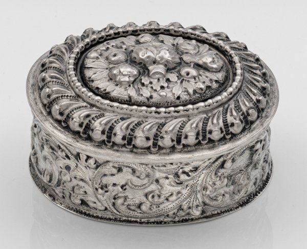 Kleine Deckeldose Silber. Oval. Leicht gewölbter, üppig dekorierter Deckel. Mittig Medaillon mit reliefplastisch gearbeiteten Birnen und Äpfeln. Wandung reich verziert mit Akanthusblattornamenten. Innen vergoldet. Gew. ca. 45 g. H. 4,5 cm x 7 cm x 5,5 cm.
