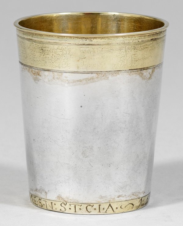 Qualitätvoller Augsburger Barockbecher Silber, teilvergoldet. Über flachem Boden sich konisch erweiternder Korpus mit profiliertem Lippenrand. Glatte Wandung mit Inschrift am Fußrand: "I.D.A.M.E.S.N: S.T.C.I.A. ~ 1695". Gest. Stadtmarke, Meister Philipp Jakob Holeisen (wird Meister 1695). Gew. ca. 113 g. H. 7,9 cm.