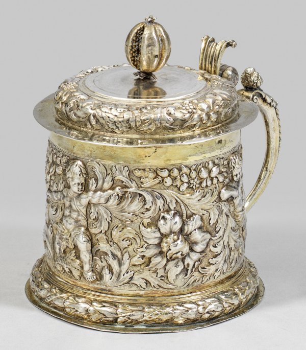 Musealer Breslauer Barockhumpen Silber, teilvergoldet. Aufgewölbter Standring umlaufend dekorativ getrieben in Form eines Lorbeerkranzes. Gering konischer Korpus mit abgesetzter, glatter Randzone. Wandung umzogen mit meisterhaft detailliert getriebenen Putti, Früchten, Blüten und Akanthusblättern. Geschweifter Volutenhenkel mit reliefplastischer Herme. Gewölbter Deckel mit umlaufendem Fries aus Früchten, Blüten und Akanthusblättern, bekrönt mit Knauf in Gestalt eines geöffneten Granatapfels. Innen vergoldet. Deckel minim. gedellt und mit kleinen Löchern. Tremolierstrich, Stadtmarke, österreichische Repunzierungsstempel (F = Brünn 1806 -1807, 1809 - 1810), Meister Christian Mentzel d. Ä. (wird Meister 1668). Gew. ca. 506 g. H. 17 cm.