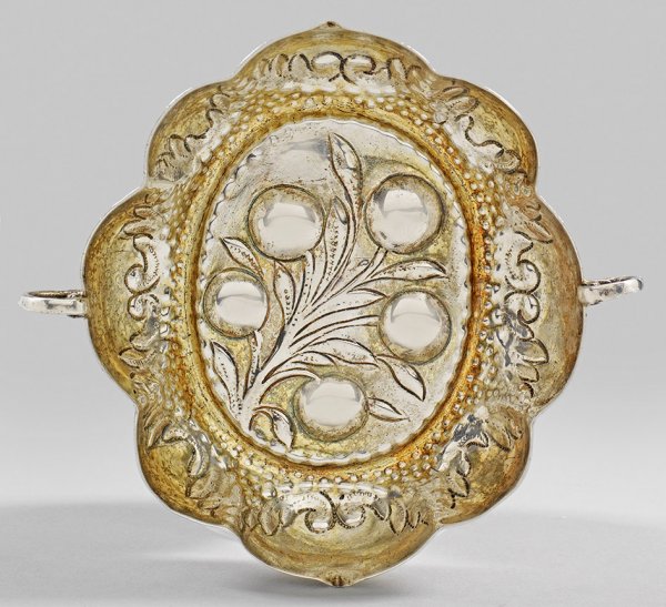 Barocke Branntweinschale Silber, teilvergoldet. Im ovalen Spiegel reliefplastisch getriebener Zweig mit Kirschen, umzogen von Punktfries. Achtpassige Wandung gerahmt von Akanthusblättern. Volutenhenkel. Gest., Stadtmarke, Meister Balthasar Haydt (wird Meister um 1645). Befreiungsstempel FR für Österreich-Ungarn 1809/10. Gew. ca. 63 g. 11 cm x 12 cm.