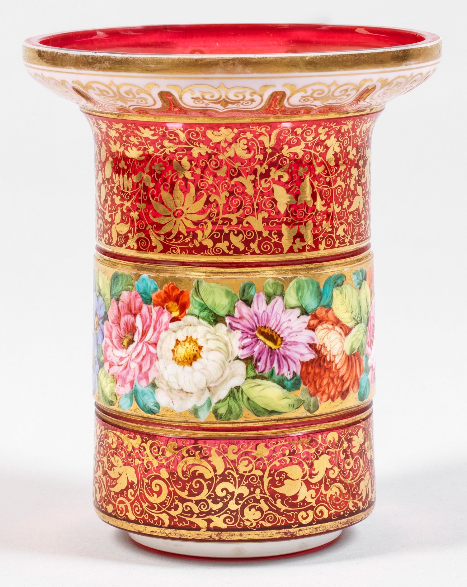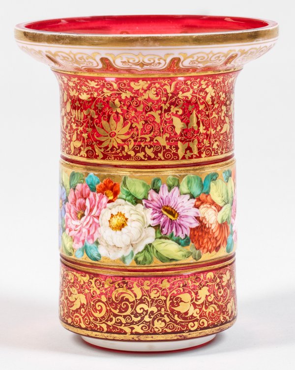 Böhmische Spätbiedermeier-Vase Farbloses Glas, rosalinfarbener Unterfang, opaker, weißer Zinnemailüberfang. Zylindrische Becherform mit abgesetztem Lippenrand. Reicher, flächendeckender Dekor, geschliffen sowie in Gold- und polychromer Emailmalerei. Auf dem Korpus ein abgesetztes Friesband mit Rosen, der Fond mit üppigem Arabesken. Am Lippenrand eine geschliffene Bogenbordüre mit Goldmalerei. H. 19,8 cm.