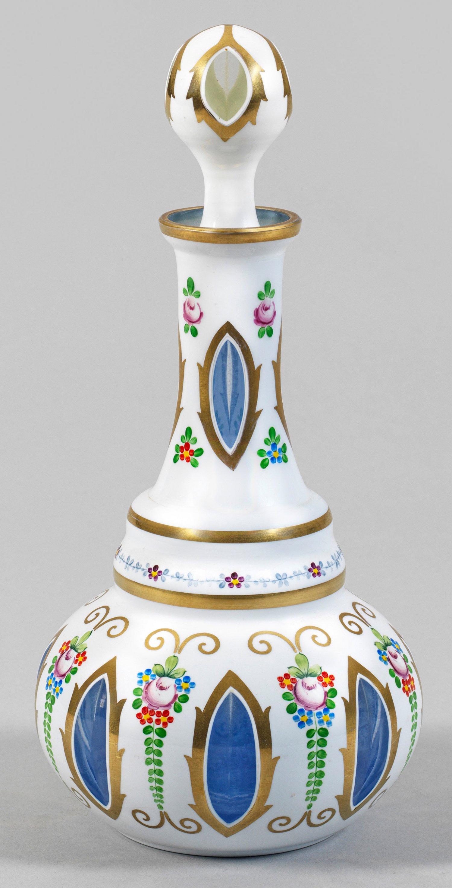 A Bohemian glass decanter and stopper. Light blue glass with white overlay, cut, polychrome enamel and gold decoration.