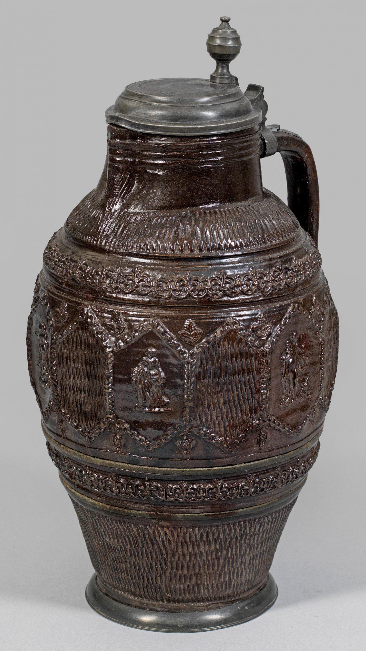 Große Creußener Kanne mit weiblichen Figuren Dunkelbraunes, salzglasiertes Steinzeug. Gestreckt-ovoide Form mit leicht konischem Hals, ausgezogener Schnaupe und Ohrenhenkel. Flächendeckender, umlaufender Dekor mit Reliefauflagen, Kerbschnittdekor und Profilrillen. Am Bauch ein Fries mit Sechseckfeldern, alternierend mit weiblichen Figuren und Netzwerk, ober- und unterhalb ornamentale Friesbänder. Rest.; Zinnmontierter Fuß und Zinndeckel, erg.; H. 40,5 cm.