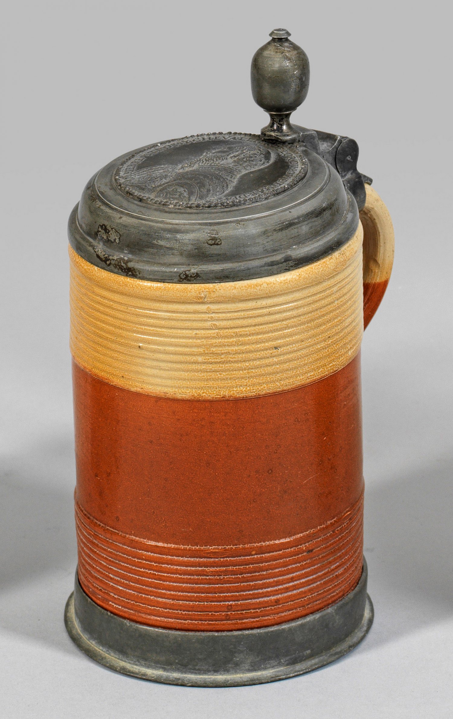Rochlitzer Walzenkrug Steinzeug. Zweifarbige, teilw. braun engobierte Wandung mit Profilrillendekor. Zinnmontierung, Deckel mit Kugeldrücker und reliefiertem Porträtmedaillon des Florentiners Piero Strozzi, Marschall von Frankreich (1510-1558). H. 23 cm.