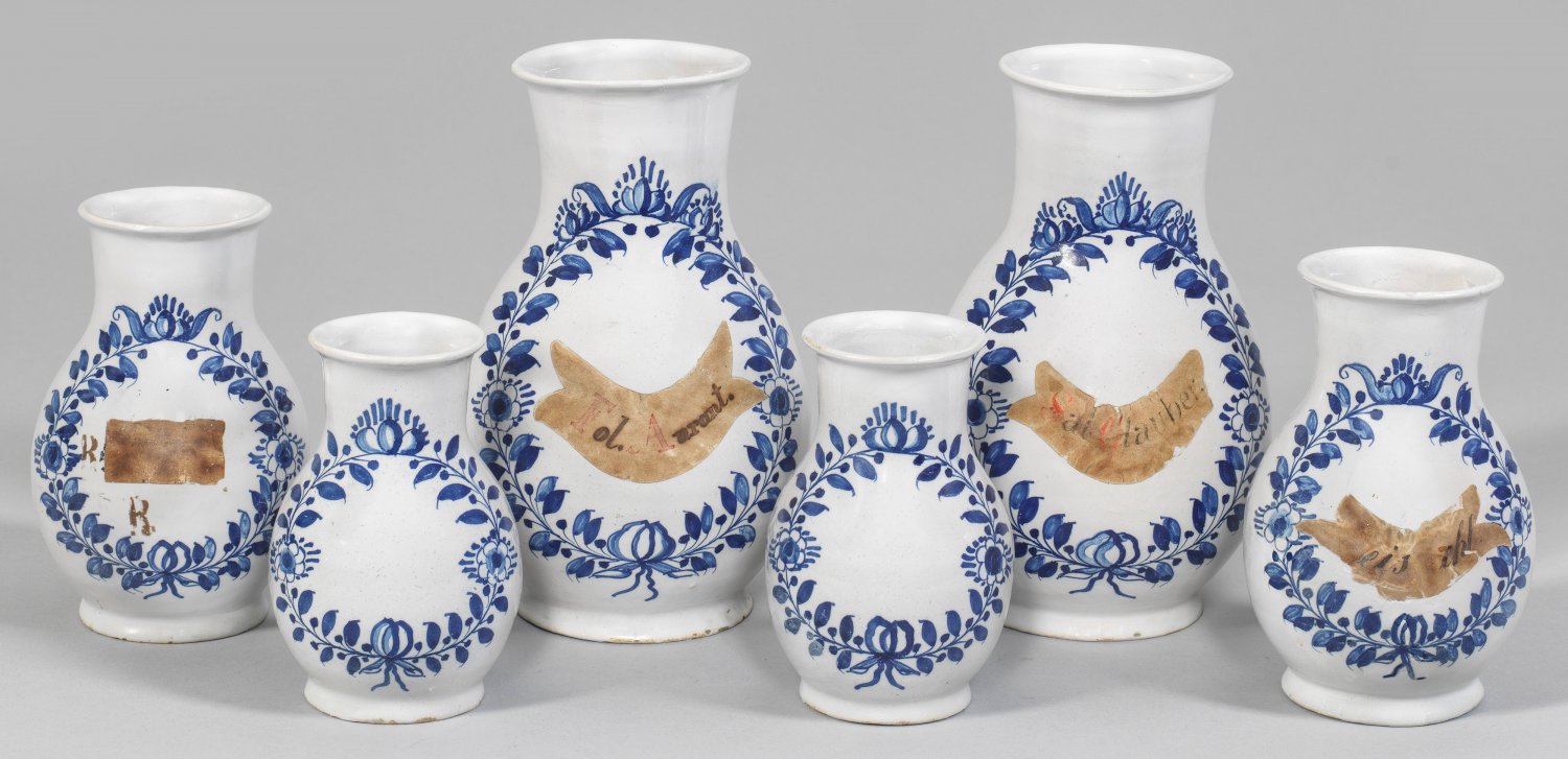 Sechs Nürnberger Apothekergefäße Fayence. Balusterform mit gebauchtem, ovoidem, in einen Zylinderhals einschwingenden Korpus. Kobaltblauer Scharffeuerdekor aus zwei miteinander zu einem Oval verbundenen Blütenstängeln, die ein freies Kartuschenfeld umrahmen. Teilw. alte, bandförmige Klebezettel mit Inschriften. Rest.; H. 13,5 cm - 21 cm.