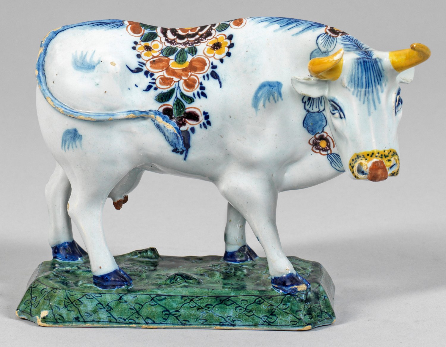 A Dutch Delft polychrome painted faience figure of a cow. Minor chips and restorations.