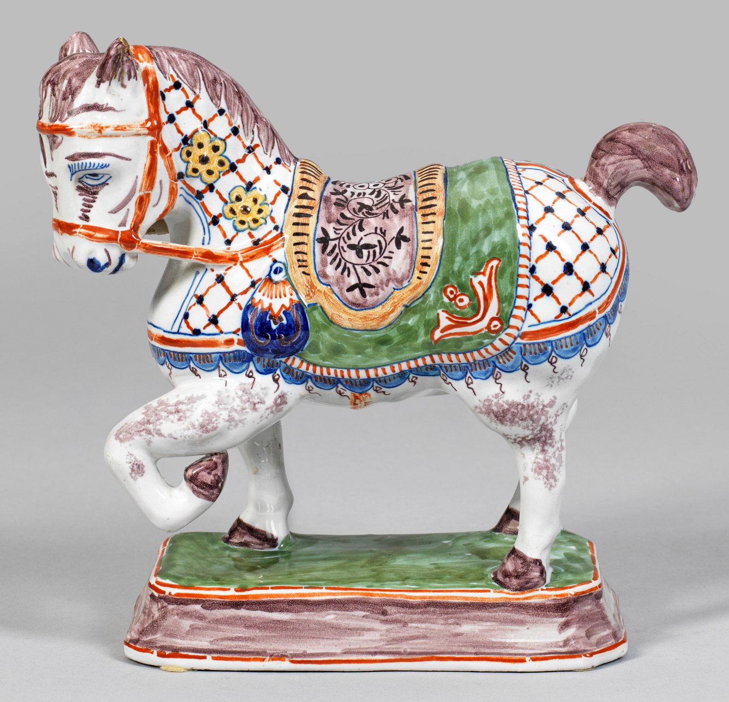 Pferd Fayence. Sandfarbener Scherben, weiße Glasur. Auf rechteckiger Plinthe mit abgeschrägten Ecken stehendes, gesatteltes und aufgezäumtes, reich geschmücktes Pferd. Polychrome Bemalung und Staffierung. Ger. best.; Manufakturmarke "JHF" mit Nr. 1480. H. 21,5 cm.