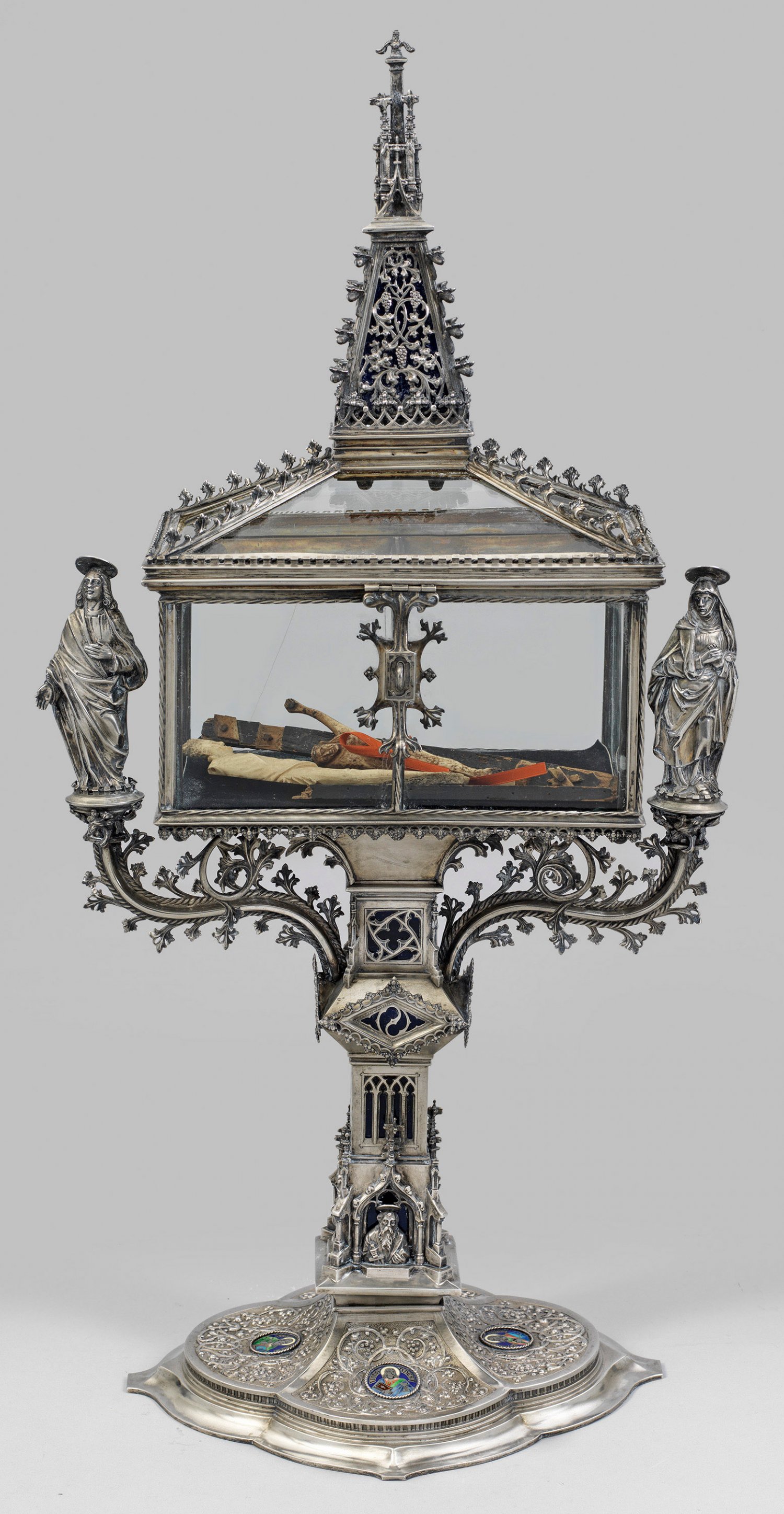 Museales neugotisches Reliquien-Ostensorium Silber. Vierpass-Fuß mit Rankenrelief und vier Evangelisten-Medaillons in Farbemail. Schaft als architektonisch gegliederter Vierkant mit Heiligenbüsten unter Wimpergen und Maßwerkfenstern. Seitlich vollplastische Figuren der Muttergottes und Johannes des Täufers auf Krabbenmuster-Armen. Verglaster Schaukasten mit Scharnierdeckel und Überwurfverschluß zur Aufnahme von Reliquien, bekrönt von einer detailreichen Fiale. Die Feinheit der Ausführung, wie sie an den Emailmedaillons und den Skulpturen ablesbar ist, deutet auf die Werkstatt eines namhaften, von der Schatzkunst des Erzbistums Köln gepägten Silberschmied. Aus der Expertise: "Die Qualität im Handwerklichen wie Künstlerischen (...) läßt an einen der führenden Goldschmiede im Rheinland denken." H. 74 cm.