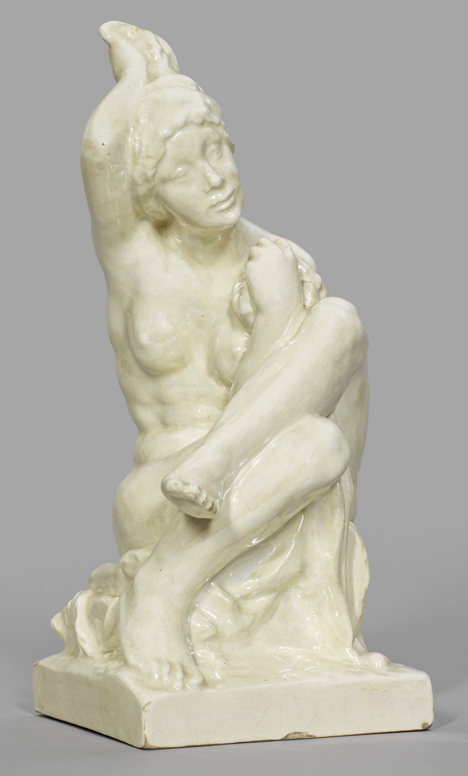 "Der Morgen". Orginaltitel Keramik (Steingut) mit perlmutterartig irisierender Craquelé-Glasur. Entw. Jan Stursa (1880-1925). In der Plinthe undeutl. sign. (bez.) u. dat. 1911. H. 38 cm.
