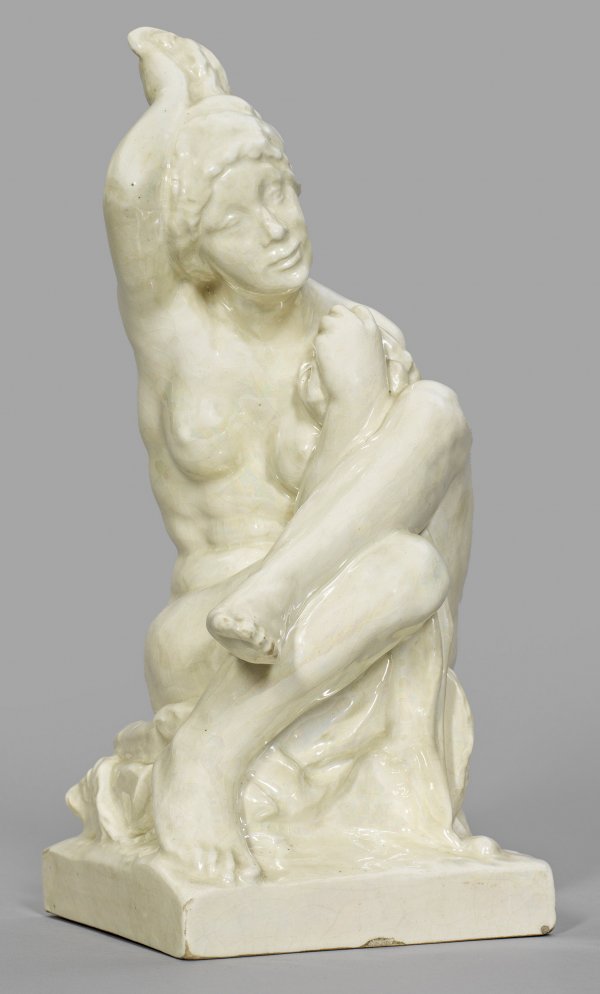 A glazed Czech earthenware figure "The Morning" designed by Jan Stursa, 1911. Indistinctly signed (inscribed) and dated on the base.