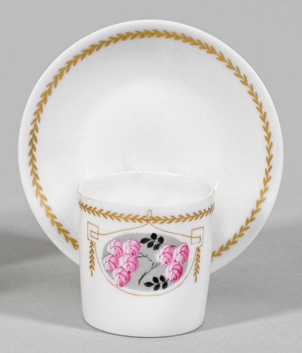 Jugendstil-Mokkatasse mit Untertasse. Rosendekor in polychromer Malerei mit Gold. Entw. A. Niemeyer und P.L. Troost. Manufakturmarke. H. 4,5 cm.