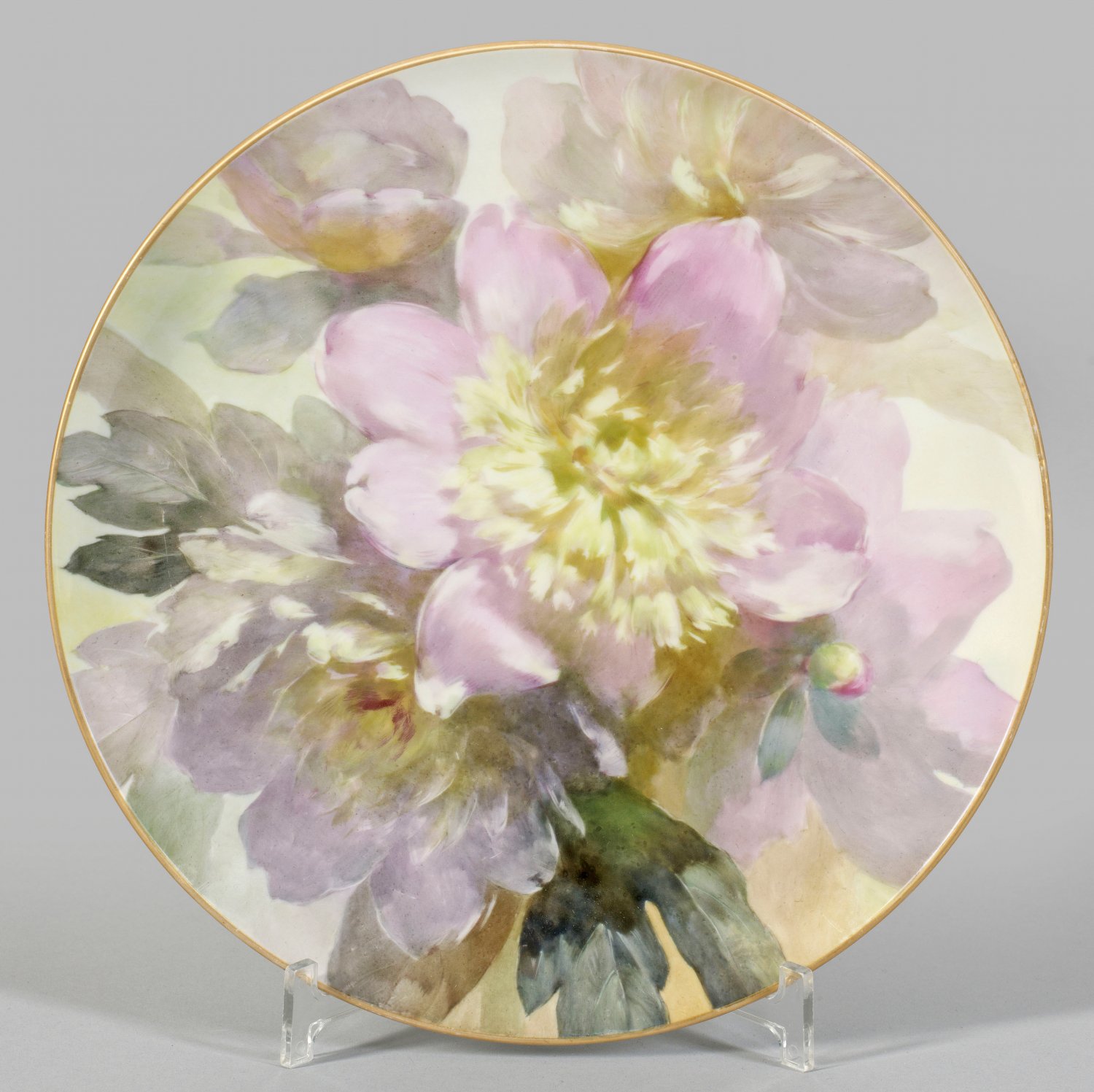 Prächtiger Wandzierteller mit Weichmalerei Runde, flach gemuldete Form mit glatten Rand. Im Spiegel flächendeckender Dekor aus großer, rosafarbener und gelblich-grüner Blüte zwischen angedeuteten Knospen und Blattwerk auf hellgelbem Fond. Feine, pastelltonige, impressiv anmutende Weichmalerei in zitronengelben sowie Rosa- und Grüntönen von Willi Papenfuss. Goldrand. Gold minim. ber.; Zepter- und Malereimarke. D. 29,5 cm.