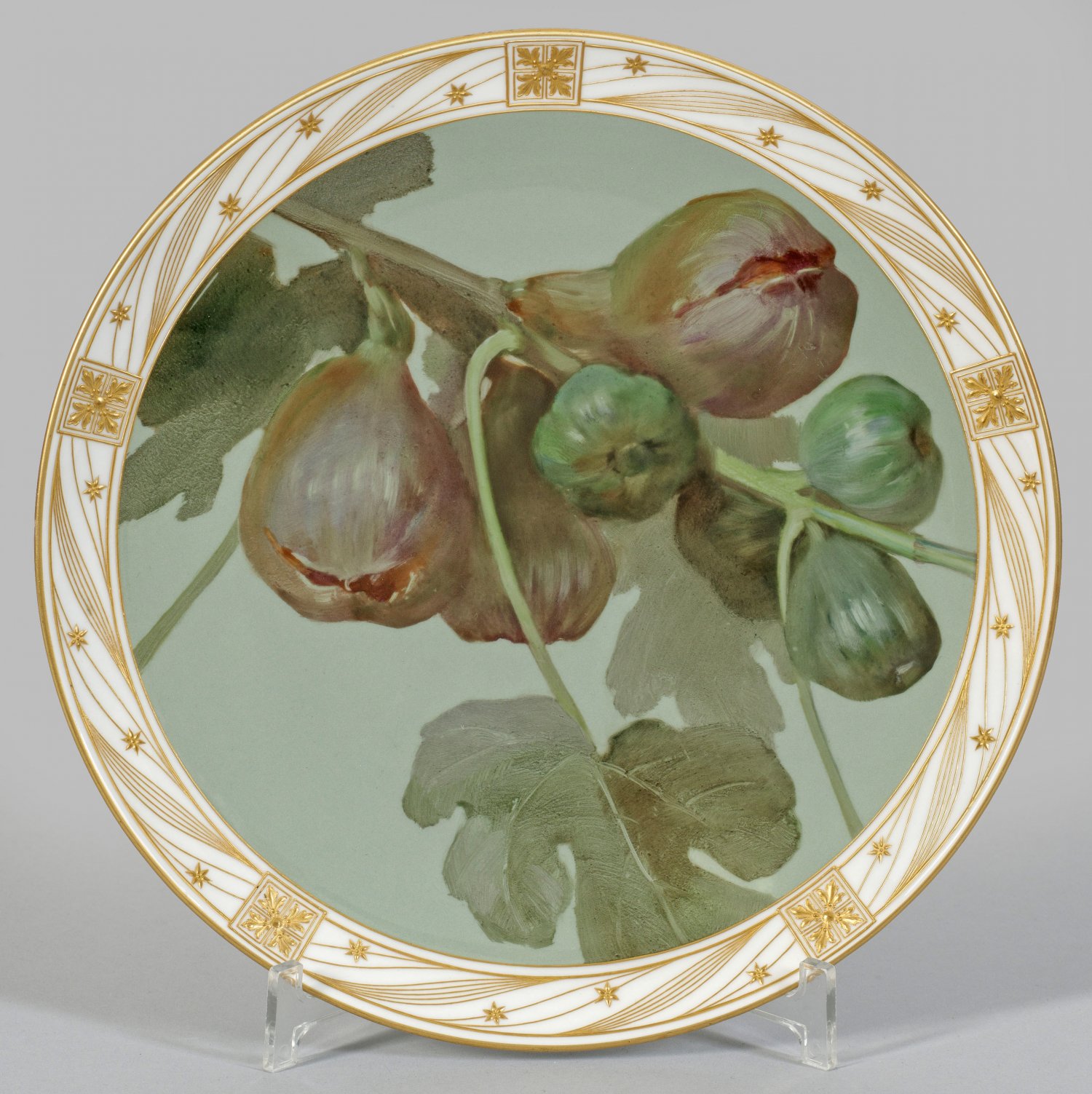 Prächtiger Wandzierteller mit Feigendekor Runde, flach gemuldete Form mit glattem Rand. Im Spiegel großflächig dargestellter Feigenzweig in grün- und rottoniger Malerei von Hedwig Blankenurg auf seladonfarbenem Fond. Umlaufend feinlinige Reliefgoldbordüre mit stilisierten Blattreserven und Sternen. Rücks. sign. "H. Blankenburg". Zepter- und Malereimarke. D. 29 cm.