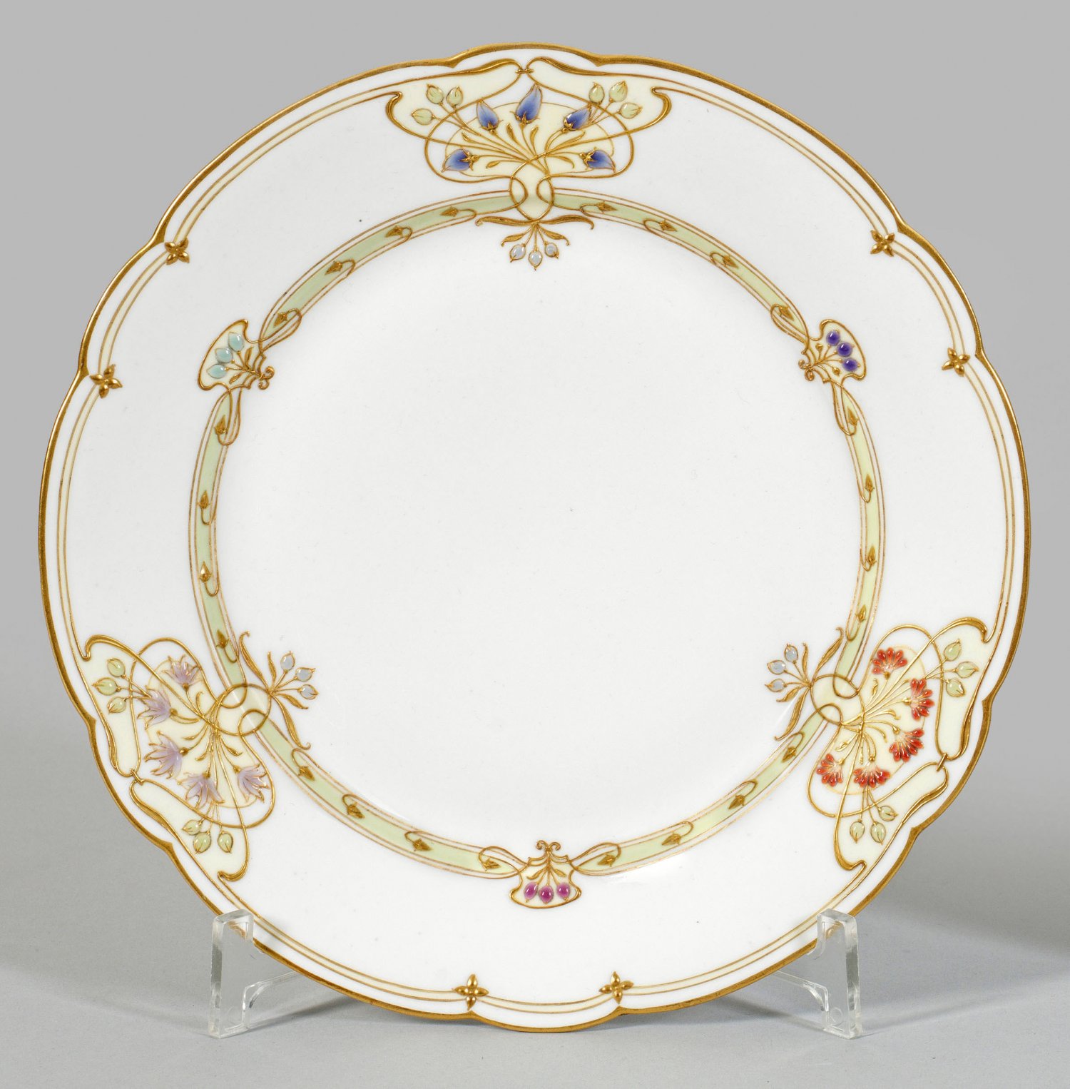 Jugendstil-Zierteller Form "Augusta". Auf der Fahne und dem Steigbord feinliniger stilisierter, axialsymmetrisch angeordneter Blütendekor in Reliefgold mit farbigen Schmelzperlen, sog. Juwelenporzellan. Polychrome pastelltonige Aufglasur- und Emailmalerei. Goldmaler-Nr. 59 für Paul Hermann Makowitz. Zepter- und Malereimarke. D. 25 cm.