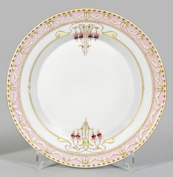 Jugendstil- Zierteller mit Dekor "Tränendes Herz" Runde, vertiefte Form. Reliefdekor "Kurland" auf rosafarbenem Fond. Übergehend vom Spiegel zur Fahne stilisierter, axialsymmetrisch angeordneter, feinliniger Floraldekor mit "Tränenden Herzen" aus farbigen Schmelzperlen und Reliefgoldlinien. Polychrome Aufglasur- und Emailmalerei. Goldstaffage. Goldmaler-Nr. 73 für Karl Haube. Gold minim. ber.; Zepter- und Malereimarke. D. 25 cm.