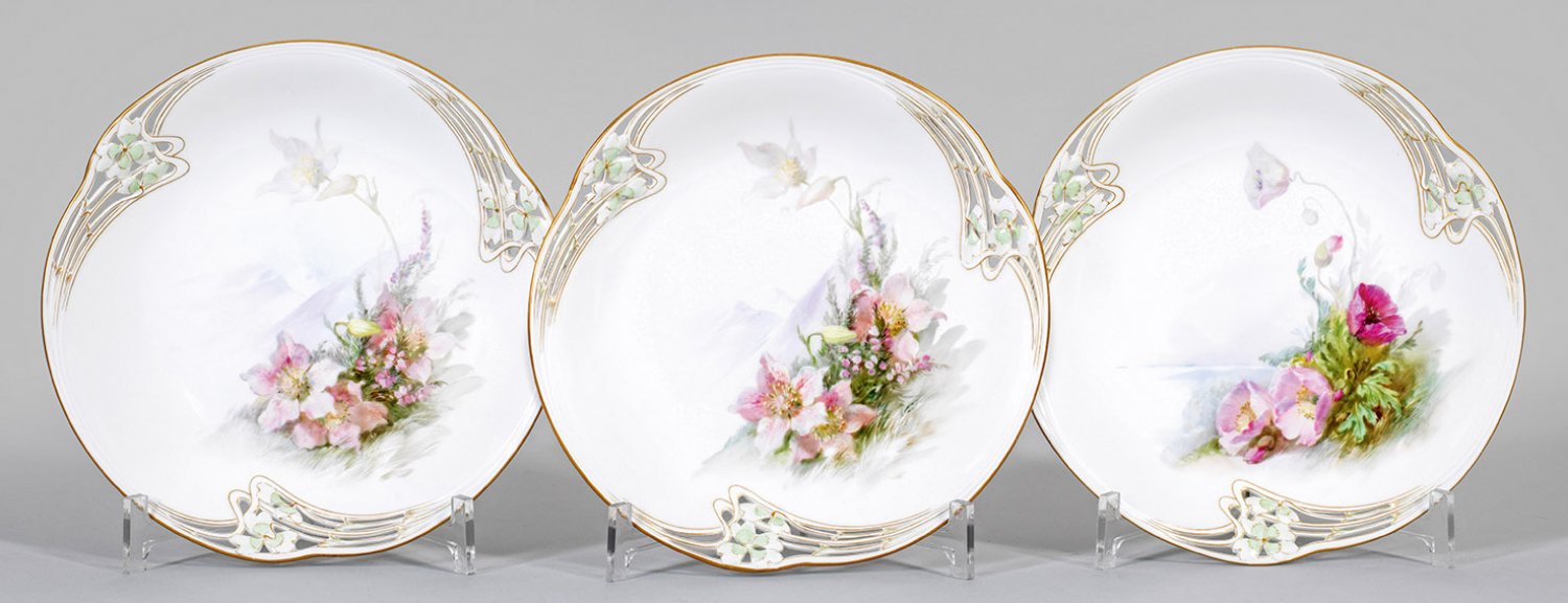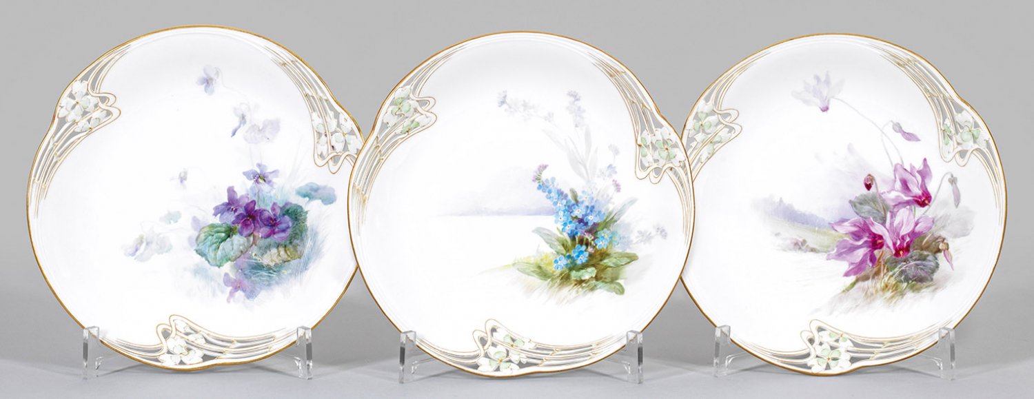 Sechs seltene Zierteller mit weicher Blumenmalerei Runde Form. Passiger, dreifach von geschweiften Linien mit Kleeblättern durchbrochen gearbeiteter Rand. Im leicht vertieften Spiegel farbenprächtige Blumendarstellungen aus Mohnblumen, Anemonen, Veilchen und Vergissmeinnicht vor aquarelliertem, verwaschenem Landschaftshintergrund. Sehr feine polychrome sog. Weichmalerei in kräftigen Purpur- und Violett- sowie zarten roséfarbenen Tönen. Zepter- und Malereimarke. D. 21,5 cm.