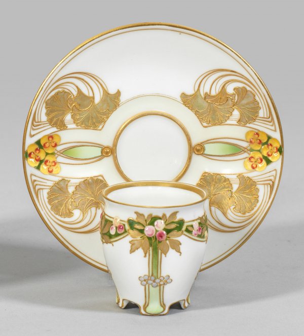 Prächtige Jugendstil-Mokkatasse und Untertasse. Auf vierfach eingezogenem Stand glockenbecherförmiger Korpus mit geschwungenem Henkel. Auf der Wandung und im Spiegel stilisierter Floraldekor aus feinlinig konturierten Zweigen bzw. Ginkgoblättern mit rosafarbenen und gelben Emailbeeren und -blüten. Polychrome Aufglasur- und Emailmalerei mit Relief- und Pudergold. Zepter- und Malereimarke. H. 5,5 cm.
