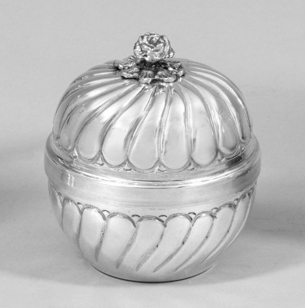 Bonbonniere Silber. Kugeliger Korpus umzogen von schmalen Godronen. Rosenknauf. Innen vergoldet. Gest. 925. Gew. ca. 120 g. H. 8,5 cm.