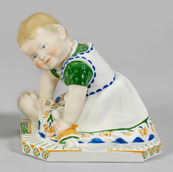 Kind mit Puppe Auf achteckigem Sockel sitzendes, sich vorbeugendes Mädchen mit Puppe. Sparsame, polychrome Aufglasurmalerei. Entw. Otto Thiem, um 1908. Modell-Nr. U 8. Manufakturmarke. H. 16 cm.