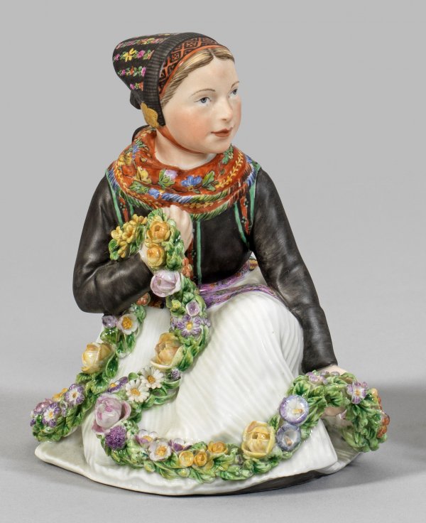 Amager-Mädchen Auf dem Boden kniendes Mädchen in Amager-Tracht, eine lange Blumengirlande haltend. Polychrome Aufglasurmalerei mit radiertem Gold. Entw. Carl Martin-Hansen. Entw.-Bez.; Modell-Nr. 12412. Maler-Monogr.; Blüten unw. best.; Juliane Marie-Manufakturmarke. H. 13 cm.