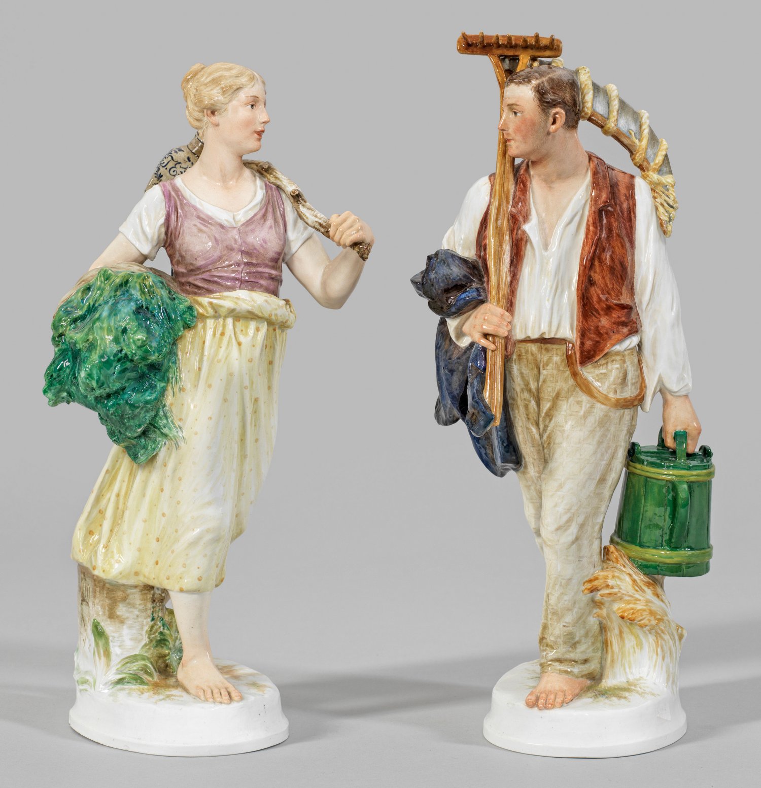 Gegenstücke. Auf ovalem, profiliertem Sockel stehender Schnitter mit Sense, Rechen und Topf in sommerlicher Kleidung. Junge Schnitterin, ein Bündel Gras unter dem Arm bzw. geschultert einen Henkelkrug und ein Tuch tragend. Zu ihren Füßen ein Wegstein mit eingeritzter, bekrönter Schwertermarke. Polychrome Malerei. Entw. Theodor Eichler, 1904. Modell-Nr. U 133 und U 134. Teilw. minim. best.; Minim. rest.; Schwertermarke. H. 35,5 cm - 37,5 cm.
