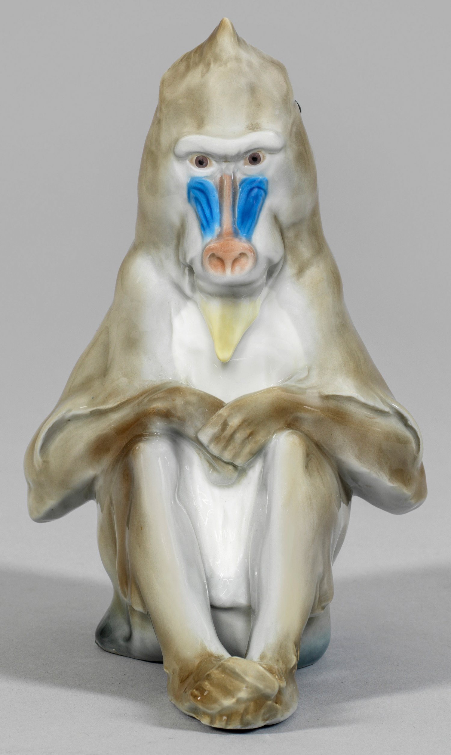 Mandrill Auf einem Fels sitzender Affe mit zusammengezogenen Augenbrauen, verschränkten Händen und Füßen. Polychrome Unterglasurmalerei in grauen und braunen Tönen mit Farbakzenten in Blau, Gelb und Rot an Nase und Bart. Entw. Otto Pilz, 1907. Modell-Nr. X 143. Schwertermarke. H. 21 cm.