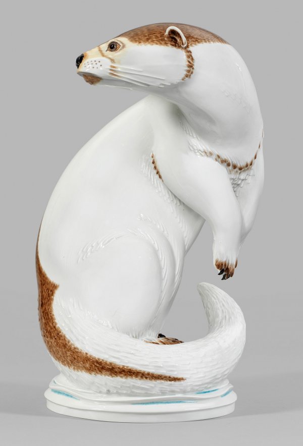 Große Figur eines Fischotters von Max Esser Auf einem Rundsockel hoch aufgerichtet sitzender, sich umwendender Otter. Stilisiert-reliefierte Fellzeichnung. Sparsame polychrome Malerei in Brauntönen, Schwarz und Blau. Entw. Max Esser, 1926. Entw.-Bez. mit Dat. 1928. Modell-Nr. A 1128. Glasurmakel. Haarrisse. Schwertermarke. H. 43 cm.