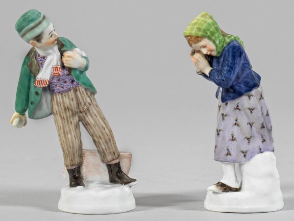 Figurenpaar "Mädchen und Knabe beim Schneeballspiel" Auf rundem, schneebedecktem Sockel stehender Knabe, einen Schneeball werfend bzw. ein Mädchen, den Schneeball abwehrend. Polychrome Malerei. Entw. Alfred König, um 1905 - 1910. Teilw. Entw.-Monogr.; Modell-Nr. W 131 bzw. W 132. Rest.; Schwertermarke. H. 12,5 cm - 13 cm.