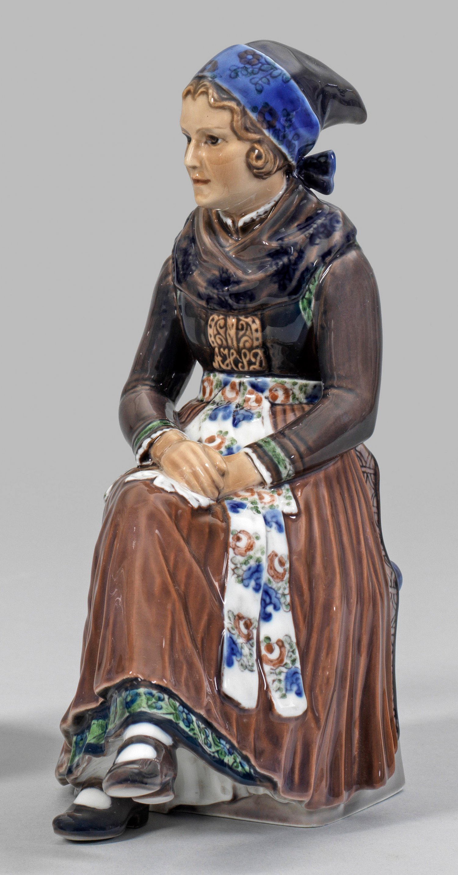 Amager-Mädchen in Tracht, auf einer Bank sitzend. Polychrome Unterglasurmalerei. Entw. Jens Peter Dahl-Jensen. Modell-Nr. 1110. Manufakturmarke. H. 23 cm.