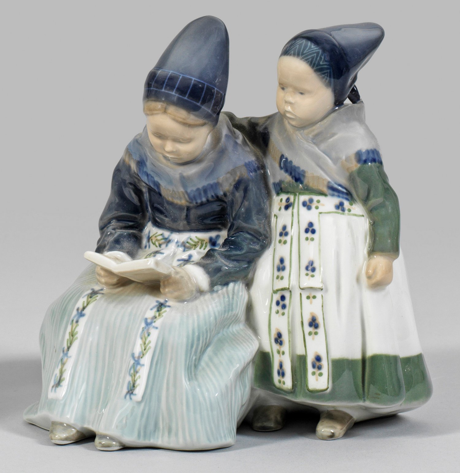 A Danish Royal Copenhagen porcelain figure group of two reading girls. Manufacturer’s mark.