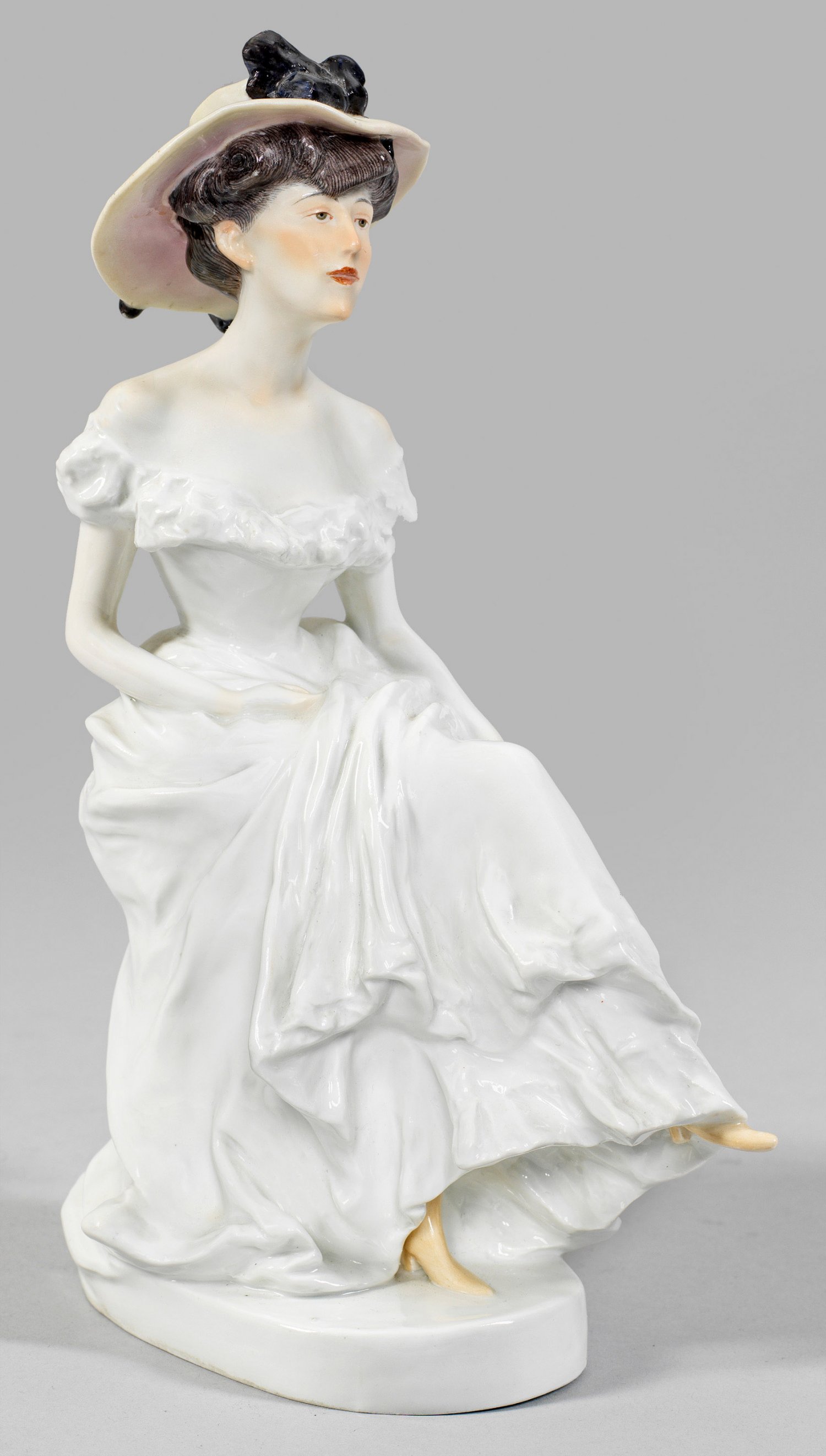 Dame mit Fächer Auf ovaler Plinthe sitzende junge Dame in vornehmer Pose, gekleidet in einem weißen, eleganten Kleid mit großem Hut. In der linken Hand einen Fächer haltend. Sparsame polychrome Malerei. Entw. Theodor Eichler, um 1907. Modell-Nr. X 183. Restored. Schwertermarke. H. 23,5 cm.